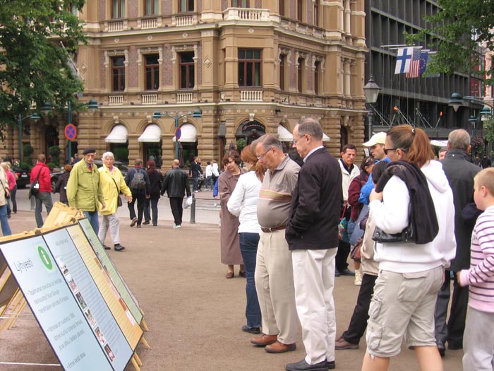 亦有很多的芬兰人来往于这个小公园。很多人都直接的去到签名桌前签名。一对芬兰夫妇卡尔(Kari)和林南(Leena)走到了签名桌前主动签名声援。他们说:“你们这样做很好。我真的很赞赏你们所做的这些。”