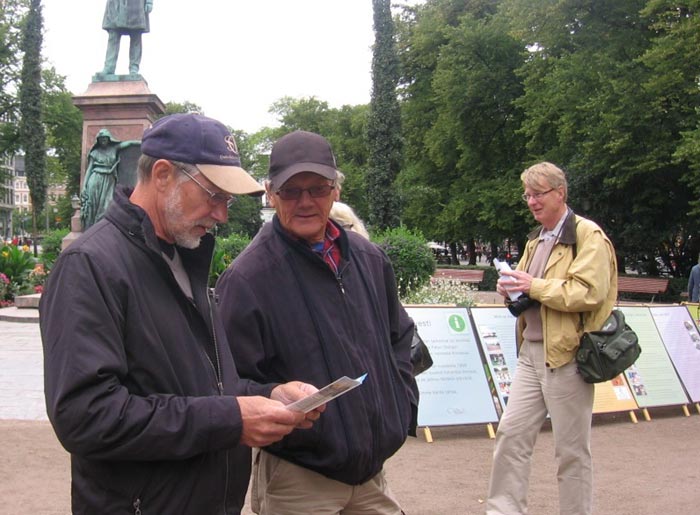 夏季的尾声,芬兰旅游的游客依旧络绎不绝。来自世界各国的人们都来到了这个小小的海滨大道公园里,品味着芬兰的文化。有来自瑞典的家庭,有来自美国的年老夫妇,也有来自欧洲的旅人,其中很多被在公园一角的法轮功学员所吸引,停下脚步聆听学员用英文和芬兰文轮番借助喇叭向游人讲述什么是法轮功、及中共对法轮功的迫害、呼吁共同制止迫害,阅读展板,索取资料,走到签名桌前签名声援。