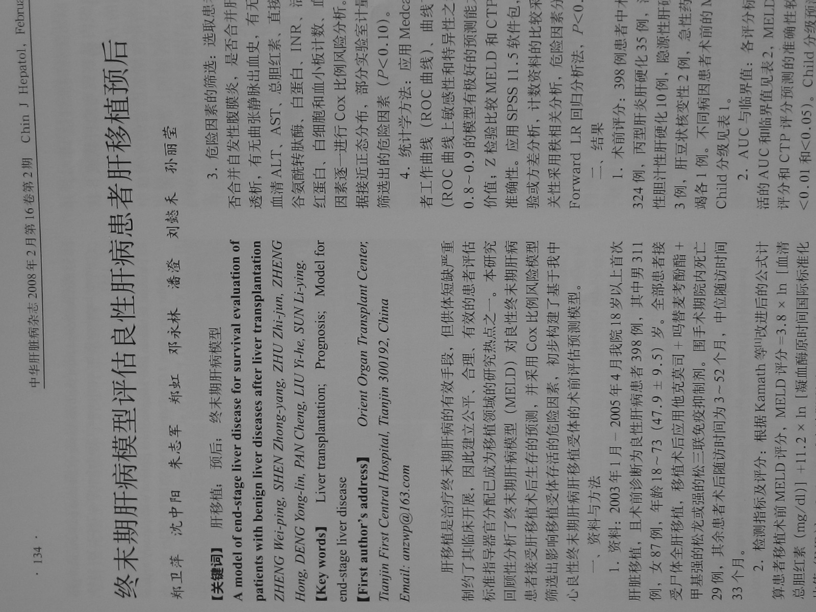 天津市第一中心医院器官移植中心(东方器官移植中心)郑卫萍、沈中阳、朱志军、郑虹、邓永林、潘澄、刘懿禾、孙丽莹等人在《中华肝脏病杂志》2008年2月第16卷第2期第134页至135页上发表署名文章《终末期肝病模型评估良性肝病患者肝移植预后》(见下图),文中提到“2003年1月─2005年4月我院18岁以上首次肝脏移植,且术前诊断为良性肝病患者398例,其中男311例,女87例,年龄18~73(47.9±9.5)岁。全部患者接受尸体全肝移植”。