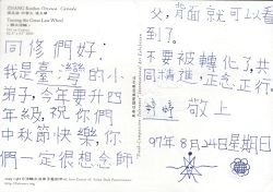前几天在台湾的明慧学校,有“中秋节一人一信关心被非法关押同修”的活动,每个法轮大法小弟子都认真的写下了对大陆同修的问候,也为同修们添正念!我家的小同修用纯净的心画了一幅营救同修的画。