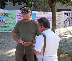 一位叫ANA的女士,年近七旬,起先匆匆而过。学员向她解释:法轮大法令人祛病健身,道德升华,却受到中共长达九年的残酷迫害。老人面带惊愕看着揭露邪党恶行的展图,然后毫不犹豫的在征签表上写下姓名。