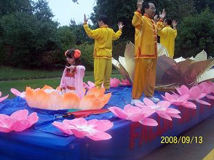 二零零八年九月十三日,美国大底特律的法轮功学员们冒雨参加了位于底特律北部特洛伊市的社区游行。