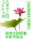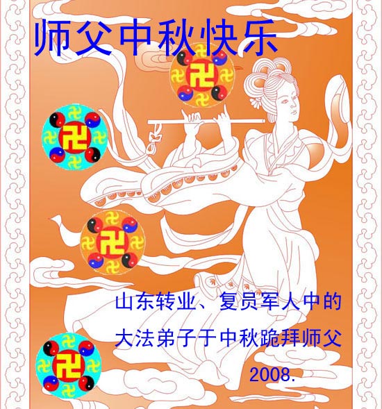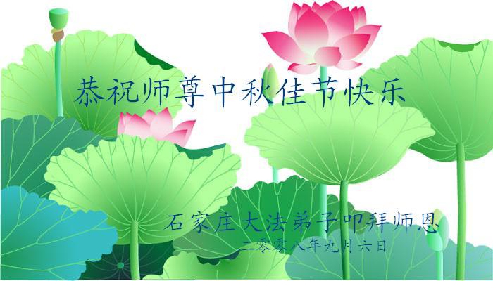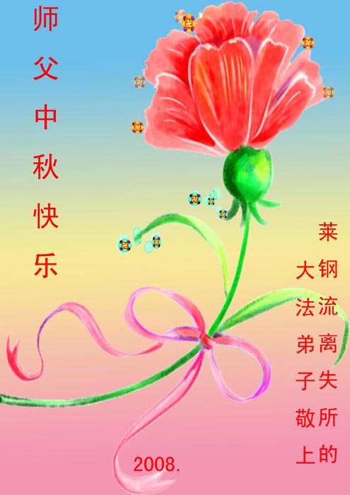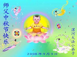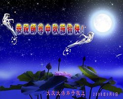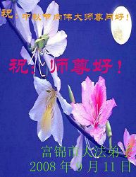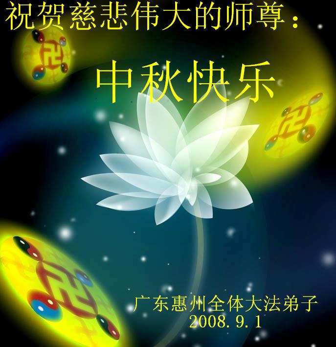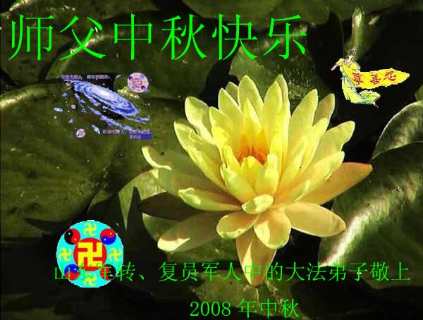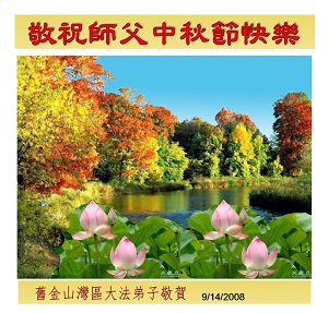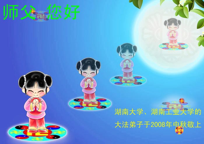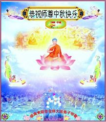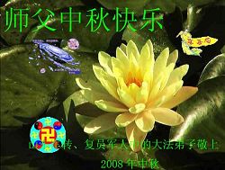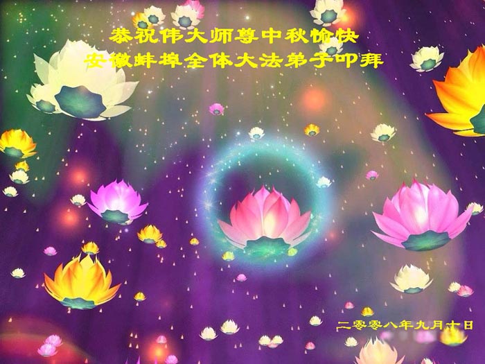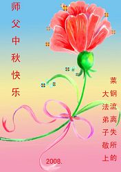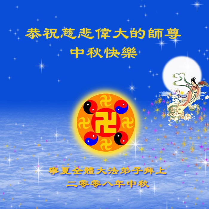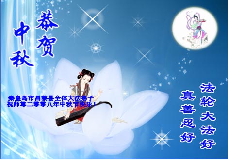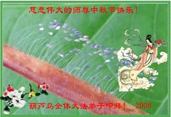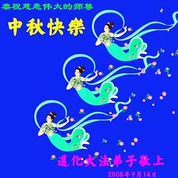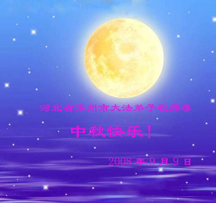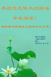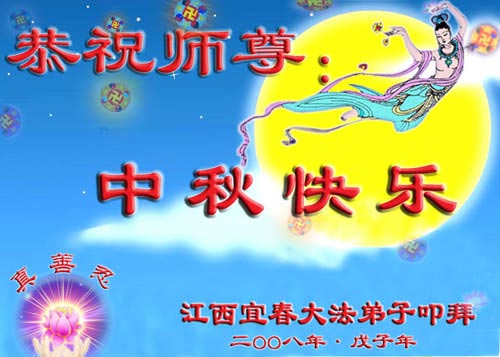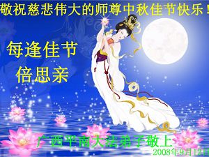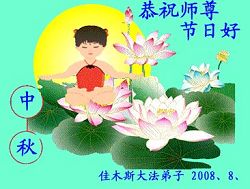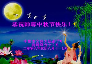 在二零零八年中秋佳节到来之际,我们中国大陆江苏常州大法弟子向您表示最真诚的祝愿!祝师尊中秋节快乐!我们一定做好三件事,走好正法修炼的最后这段路,救度更多的众生,完成助师正法的史前大愿,完成正法时期大法弟子的神圣使命!