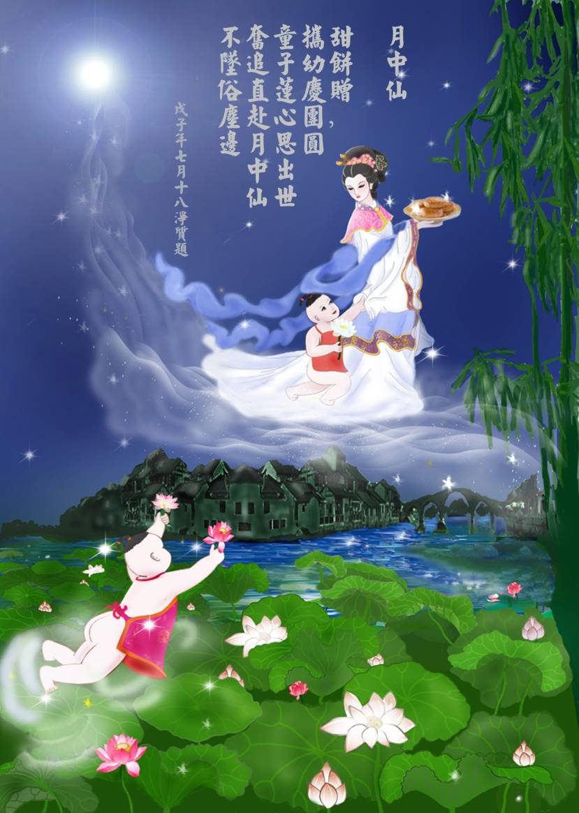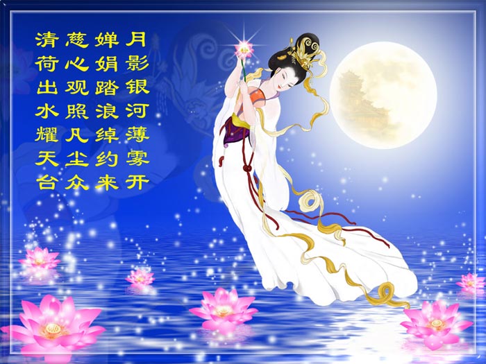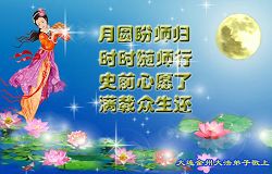我是一位四川流离失所的大法弟子,99年以来,我在证实法救度众生的风风雨雨中历尽艰辛,被邪恶迫害了长达五年之久,生不如死。在伟大的师父的慈悲呵护下,才终于走到了今天。为了感谢师尊对弟子的慈悲苦度与万分珍惜,弟子特在这中秋来临之际,为了表达弟子对师尊的无限感恩,特写下宋词献给慈悲伟大的师尊:祝师父中秋快乐!