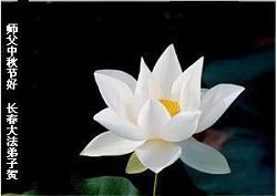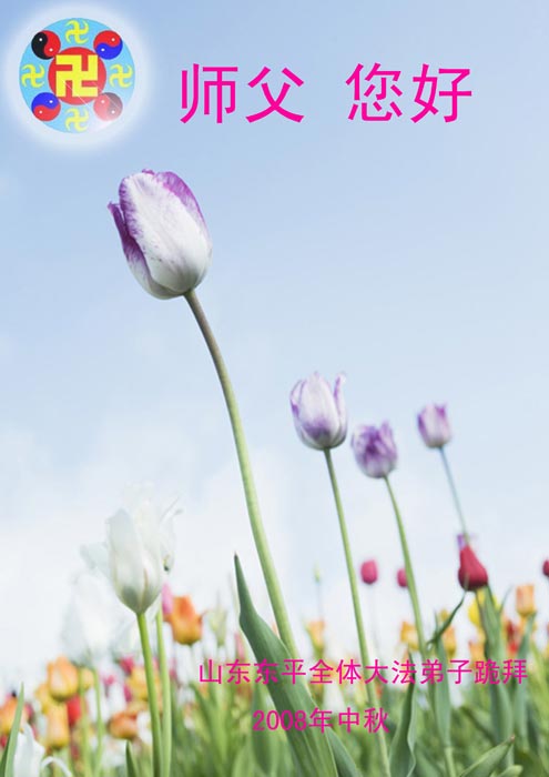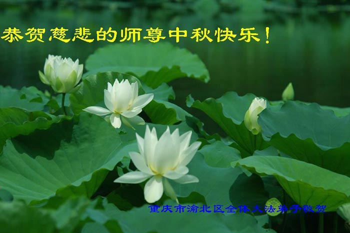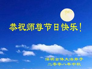尊敬的师尊:您好!在二零零八年中秋佳节到来之际,我们重庆市沙坪坝区全体大法弟子向您表示最真诚的祝愿!祝师尊中秋节快乐!我们一定按照师尊的要求,做好三件事,走好正法修炼的最后这段路,发挥最大的能力,救度更多的众生,完成助师正法的史前大愿,不负正法时期大法弟子的神圣使命。