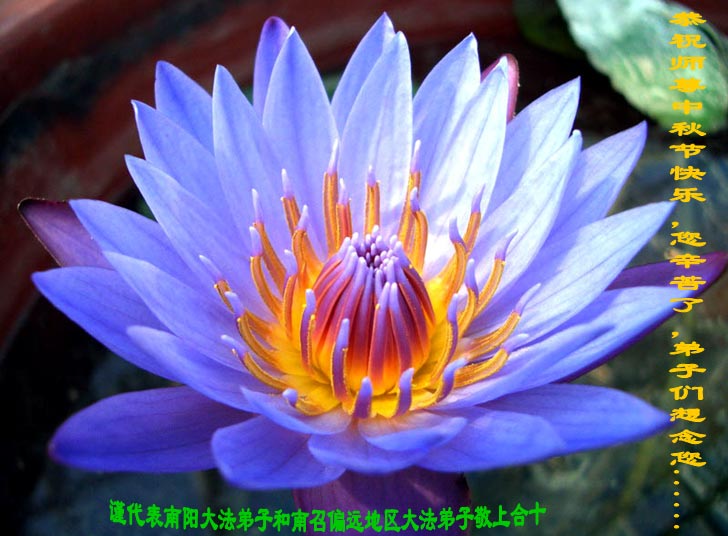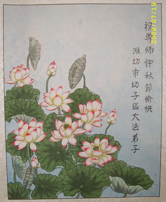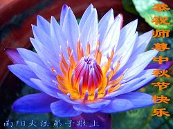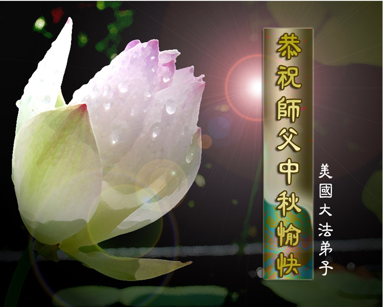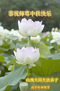 弟子们跟随师尊正法修炼走过了九个年头,请师尊放心,弟子们真的成熟了,弟子会稳健的走好最后的路,在做好三件事中修好自己,才能使更多的众生得救。弟子们唯愿师尊少一份操劳,多一份欣慰!愿中秋那轮明月带去家乡弟子纯真的敬意和问候,大法弟子如同那满湖盛开的青莲带给世人得救的希望。
