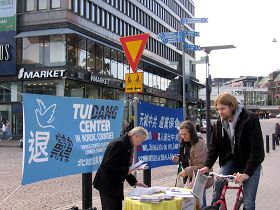 二零零八年九月十三日,北欧退党服务中心的义工和部份芬兰法轮功学员又一次来到了赫尔辛基中心火车站一侧,在全球已超过四千二百万人退出中共及其组织之时,声援退出中共的勇士。