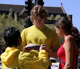 法轮功学员杨女士告诉记者,说她每天风雨无阻的来到这里,就是为了让人们了解在中国法轮功学员所遭受的迫害,希望善良的澳洲民众能够和我们站在一起,帮助早日结束这场迫害。