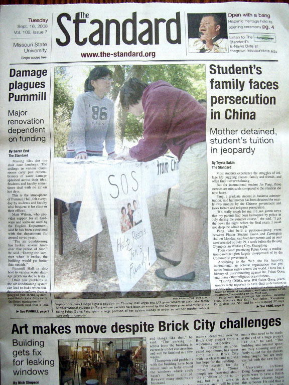 学校的校报“The-Standard”在征签的第二天头版大篇幅报道了庞靳的故事,并呼吁学校的同学们和老师们一起来关注这件事。文章写到:“这不仅仅是对她本人的支持,更是对人权和人道主义的支持。”学校学生会的主席告诉庞靳,他会尽自己的所能呼吁更多的学生和学生组织一起来帮助营救她的家人。