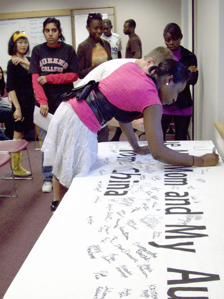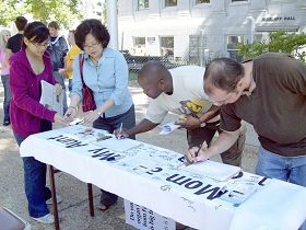 为了营救下落不明的母亲和被非法劳教的姨妈,为了呼吁美国政府和美国民众关注并帮助制止这场在中国发生的对法轮功学员的残酷迫害,庞靳和朋友们发起了“help rescue my mom and my aunt from China”(请帮助营救妈妈和姨妈)的校园征签活动。