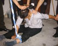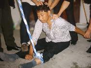 2001年9月27日早上七点半,在张士教养院警察史凤友、程殿坤幕后指示下,七八个“帮教”人员开始对我进行洗脑。我不配合,他们便撕下伪装对我大打出手,我严厉的正告他们:这种卑鄙的行为是违法的,这七八个人恼羞成怒把我扑倒在地,在挣扎中我的脚被铁器划伤,袜子撕破,脚上鲜血直流。