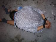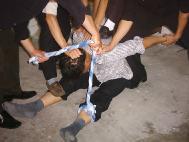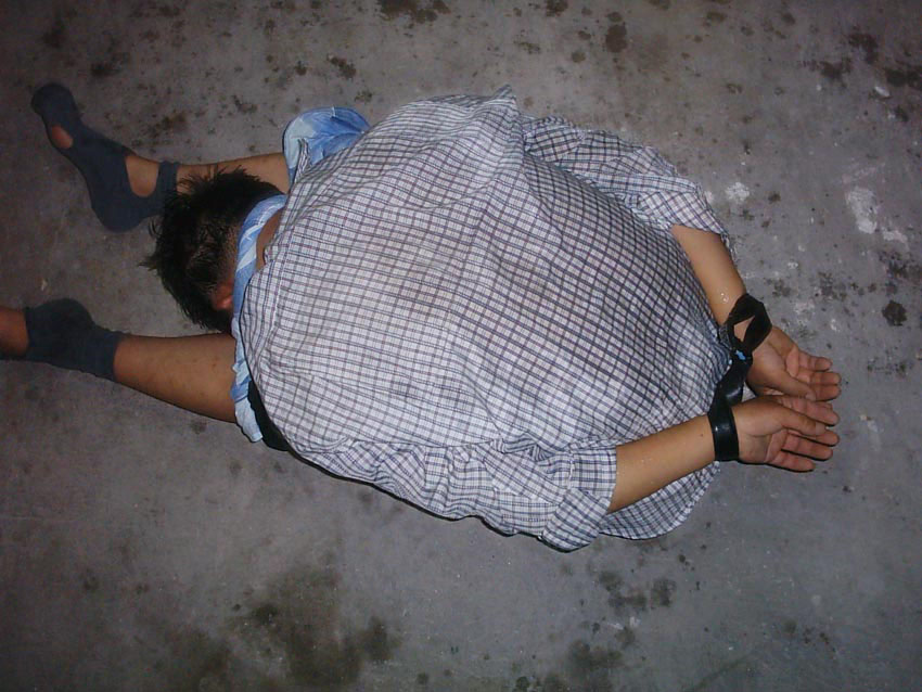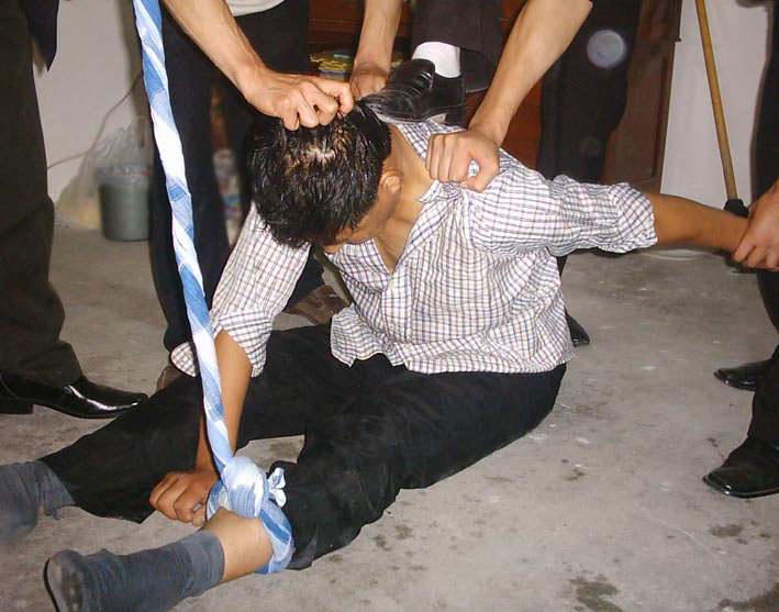 最后我被按到了铁桌下,他们先把我的腿水平固定在地面上,大约四个人勉强按住我的脚(双腿成30度角),使我不能动。剩下的几个人把我的脖子绑在两个小腿肚上,然后开始往下压我后背。我是个大块头,身材又高又胖,当时体重有90公斤,肚子大。平时坐着最多也只能保持上身与下身成90度角。而此时却把我的上身压平与下身成0度角,肚子被压错位挤到两侧,脖子与脚踝骨成一条直线。然后用床单把我的脖子和脚一起固定住,这使我上身不能抬起一点。这时我的面部和腹部同时触到地面,而后又把我双手反绑。
