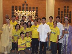 晚上九点半,轮到社团“法轮大法社”的表演。“飞旋的法轮”歌曲一响,大幕拉开,一片金黄,台下一阵热烈鼓掌,穿着印有“FALUN DAFA”、“法轮大法”字样鲜黄色衣衫的五位法轮功学员演示着法轮功五套功法,与后面拉出的“法轮大法”字样的三米金黄横幅,在舞台灯光下形成一条宽大金光带,向台下放射着光芒。