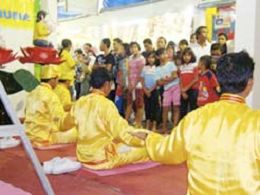 八月二十四日,法轮大法学员组成的腰鼓队在展览大门口演出,让被誉为巴里岛艺术之都的基安亚的民众有机会目睹来自中国的传统艺术。人们被学员的艺术表演所震撼,更对法轮大法感到好奇。