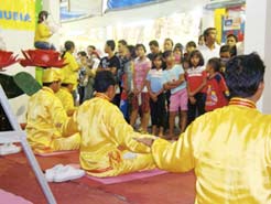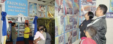 在法轮大法的展位上,数名学员演炼五套功法。很多观众以前都没看过法轮大法的功法。许多观众问道,炼功有什么好处?什么目的?如何炼?为什么法轮大法在中国大陆会受到迫害?学员耐心的一一解释并发送传单。