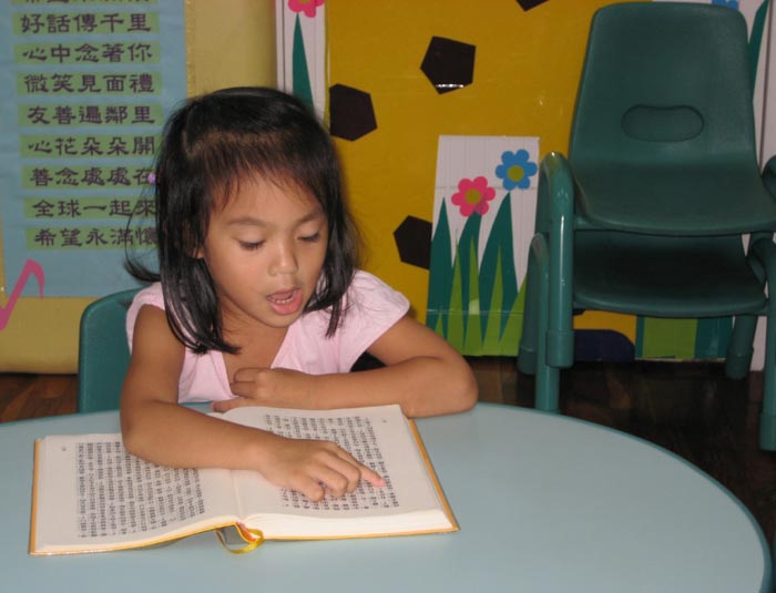 今天学法读的是《转法轮》第一讲中的“法轮大法的特点”,小朋友手指头点着念读的地方,跟着老师一字一句的读,五岁多的小洪薇认真又专注。来接她下课的妈妈表示,十年前在大陆家乡即已接触大法,知道法轮大法好,很可惜没有真正走进大法中来。她说:“豆豆园是以真善忍为教学基础的,各方面也都有做到这样一个标准,我希望洪薇从小接触这样一个环境,可以让她保持天真善良和正直的品格。”