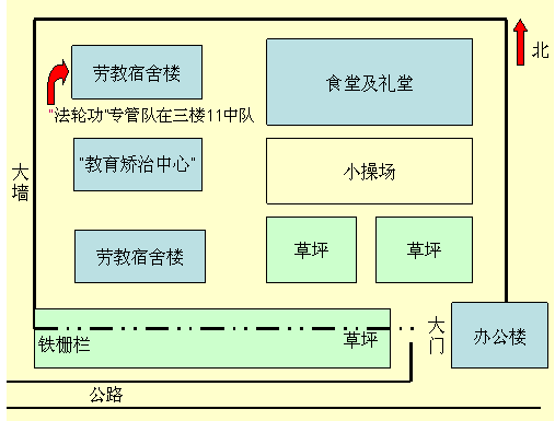 自二零零七年十一月一日,北劳教区搬至南劳教区(劳教人员减少,合二为一),集中关押法轮功学员的十六中队也由北区搬到南区三号楼三楼。一号、三号楼为劳教宿舍楼,二号楼名为“教育矫治中心”。(见图)