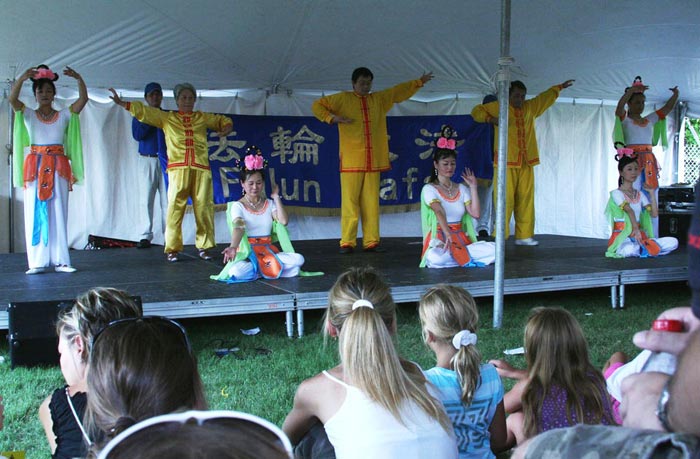 四点至五点,在气球节的社区舞台上,法轮功学员们各类表演吸引了人们的目光,展现了大法修炼者的风采。他们向人们演示了法轮功五套功法;五位女学员表演的舞蹈《花仙》受到热烈欢迎,还有一名小弟子的二胡独奏、西方学员演唱的大法弟子创作的歌曲,天国乐团两次上台为观众演奏。