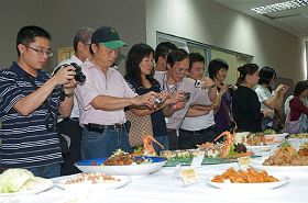 发榜典礼后,并设五大菜系品尝晚宴,也非常的温馨热烈,让与会的五十七桌贵宾们大开眼界。晚宴菜肴有:绍兴醉鹅、麻辣牛肚、凉拌杏鲍菇、港式虾卷、XO酱炒双蚌、菊花三丝羹、葱烧海参、樟茶全鸭、黄金鲜虾球、霸王风味排、宫保花枝、尖椒炒马铃薯、葱烤海鲜酥、清炒鳝鱼片、瑶柱娃娃菜、杏仁香奶露、合时鲜水果。