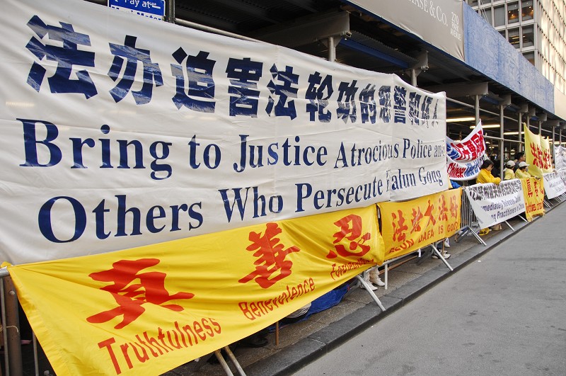 从芝加哥来到纽约呼吁制止中共迫害法轮功的美中法轮大法学会会长杨森说:“一九九九年七月以来,每当有中共高官到海外来,包括迫害法轮功的元凶江泽民,法轮功学员都会来传达这个信息。”