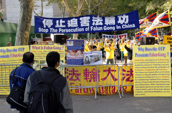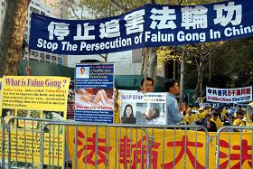 ![]() 法轮功在联合国前,以及温家宝下榻的沃道夫旅馆前集会,要求结束迫害。 |
