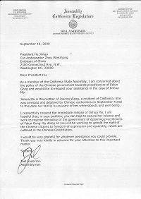 美国加利福尼亚州众议员乔尔•安德森二零零八年九月十八日致信中国主席胡锦涛,要求释放正被非法关押的合肥市法轮功学员马金花。