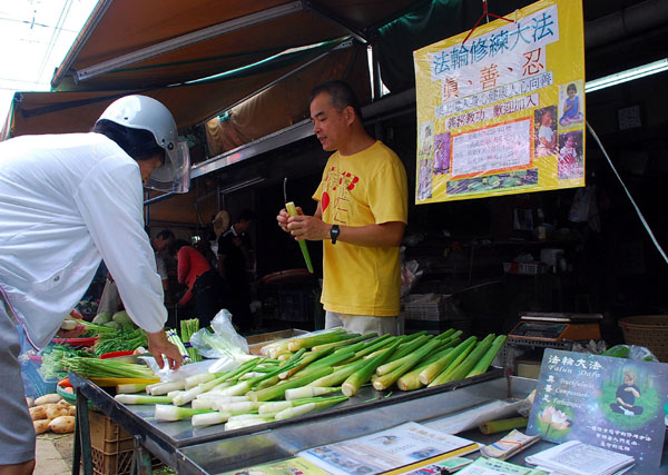 自从修炼了法轮功,感受到大法的美好后,他就在菜摊子摆上各种法轮功的介绍资料,包括举办“九天班”(法轮功学习班)的讯息,让来买菜的人随意取阅,希望有缘人都能得法修炼。他指着法轮功的简介说:“那才是我的正业(生命的归宿)。”又指着摊子上的菜说:“这只是副业(常人的职业)。”