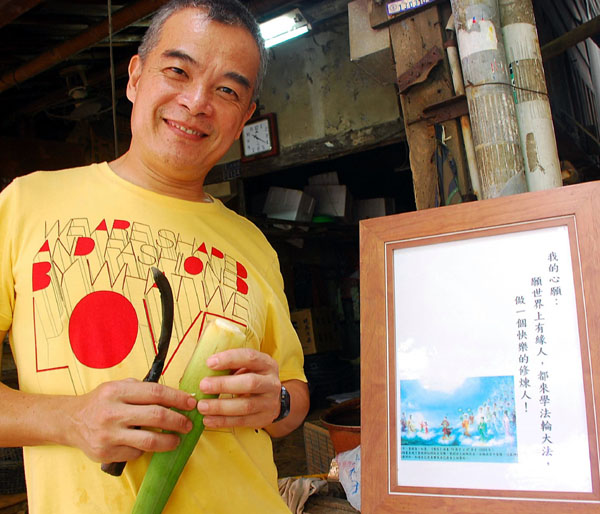 他在菜摊子旁竖起一面小匾额,诚恳的写上他的心愿:“愿世界上有缘人,都来学法轮大法,做一个快乐的修炼人。”