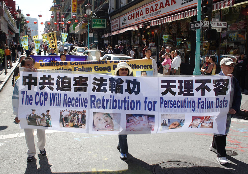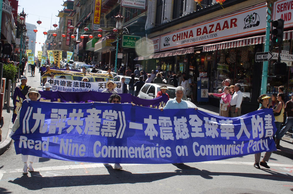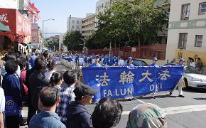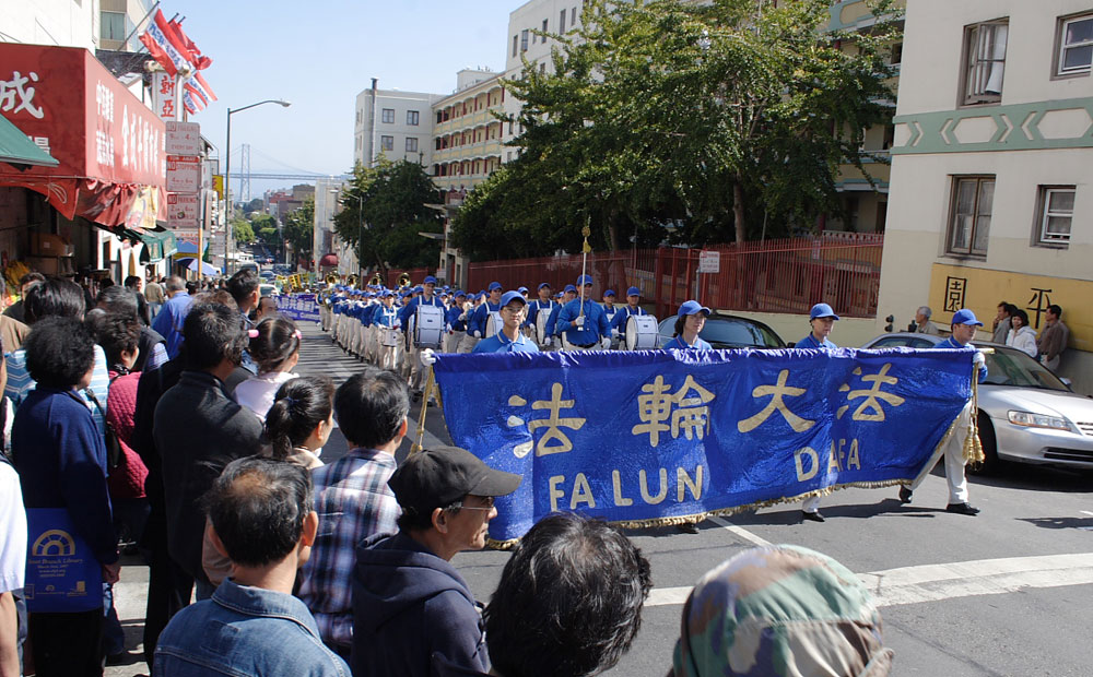 游行队伍由法轮功学员组成的天国乐团和退党方阵组成。队伍沿着都板街穿过繁忙的中国城,雄壮的乐曲吸引了许多路人驻足观看。