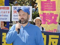 集会主持人王枫表示,自从《九评共产党》社论发表以来,有越来越多的中国民众退出中共邪党。九评真正的揭露了中共的本质,揭露了中共是历史上最大的邪教。我们今天在这里声援四千三百多万中国民众退出中共。我们一直在要求解体中共,因为中共一直在迫害法轮功。