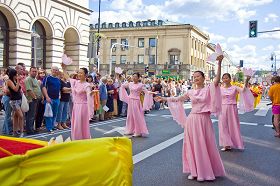 在游行队伍中,一辆挂有“法轮大法好”的船型车格外引人注目。车上,身着黄色炼功服的法轮功学员向两旁观众展示优美祥和的五套功法,车前车后,是由法轮功学员组成的舞蹈队和腰鼓队,车旁,学员身着唐装向观众发放法轮功真相传单。一摞又一摞的传单几乎都被“一抢而光”,阵阵鼓声伴着“法轮大法好”歌声在空中回荡着,精彩表演,赢得观众的热烈掌声,古老中华文化,深深打动波兰人的心。