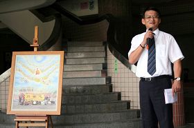 屏中校长李良末以地主之谊欢迎大家,他表示适逢学校开学典礼的日子,所以雄壮的鼓声和柔美的古筝给学校增添不少喜气。一定要鼓励学生多利用时间去参观画展,希望法轮功“真善忍”的精神能够在屏东中学扎根。