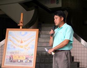台湾屏东县议员李世斌上台先来句“法轮大法好!”他说:伟大的人格才有伟大的创作。对于当今中共以邪恶的手段迫害法轮功,他表示,“真善忍国际美术巡回展览”一定可以唤醒东西方更多的人对邪恶的唾弃。