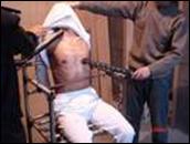 2006年4月18日,你又带领恶警们对理工大学教师孟凡全(见下图孟凡全及其小孩)非法绑架抄家。你哄骗孟凡全的小孩开门,得逞后凶相毕露,大肆抢劫孟老师的居家用品,连孩子听古筝曲的mp3也被抢走,吓得孩子浑身哆嗦,后来一想起当时情景还不寒而栗。致使孟凡全老师于二零零六年九月被非法判七年重刑,十月二十四日被非法关押于冀东监狱二支队严管队,遭恶警精神及肉体的残酷迫害:不让睡觉,一闭眼就用针扎;电棍电(见下示意图);恶警及犯人暴打;二十四小时包夹,不许与人说话;灌输邪恶理论,长期播放诬蔑大法的光碟等等。目前孟凡全老师身体极度虚弱。好端端的幸福小家庭,被你迫害的妻离子散。