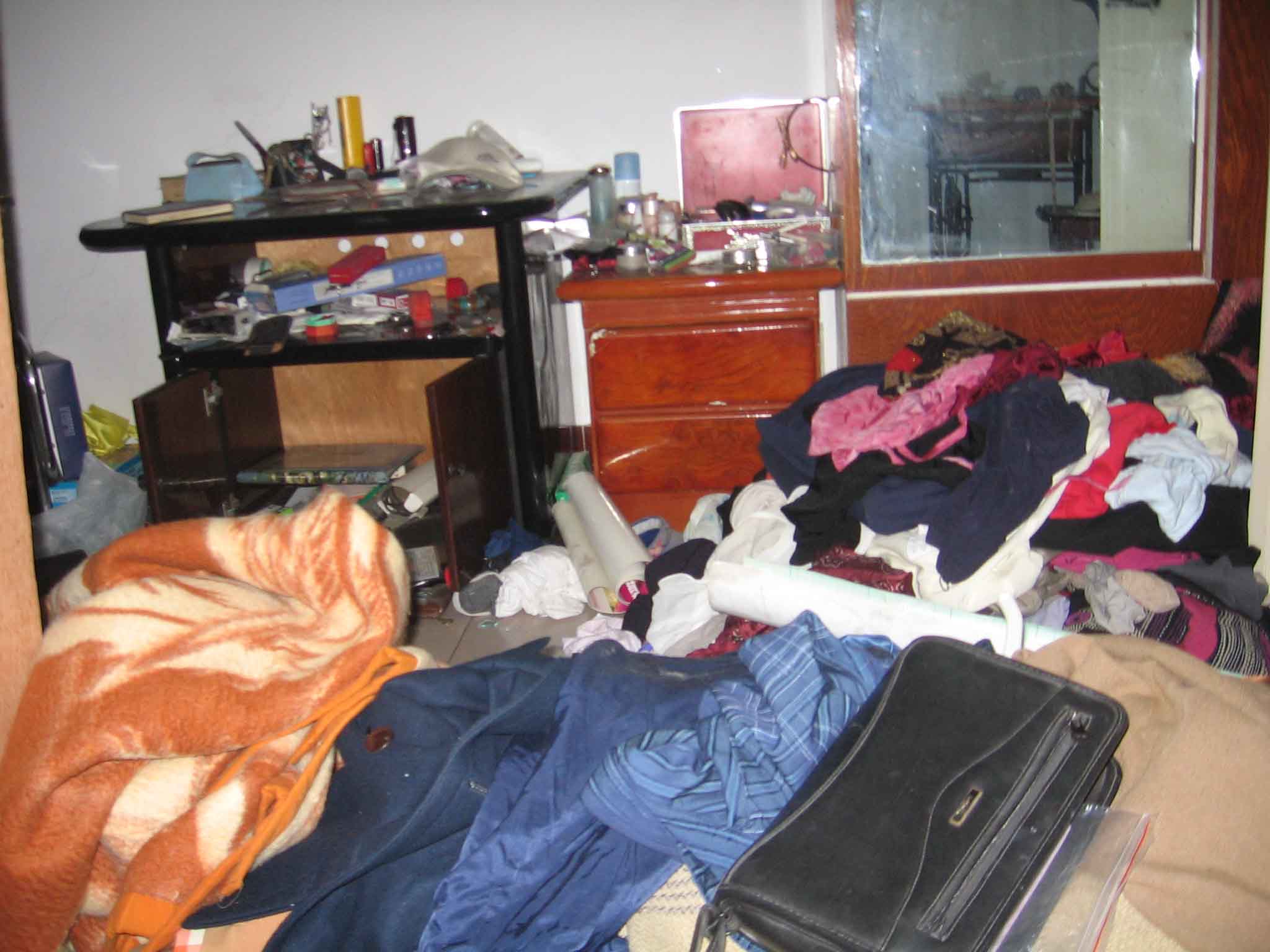 2008年7月10日,你带人与钓鱼台派出所恶警,绑架住在电厂公房六楼的何益兴、张月芹老夫妇。因你们撬坏门锁也无法打开房门,竟然调来两辆消防车,利用其升降云梯,砸碎了住在六楼的张月芹家南、北两面的窗玻璃,破窗入室绑架了两位老人。同时非法抄家,把大女儿与他人合伙做生意的六十八万元现金和其他贵重物品掠夺一空(见下图非法抄家后家里一片狼藉)。同一天,你又绑架了二女儿何艳、女婿孙锋利以及法轮功学员刘国耀和刘素英,关押在唐山第一看守所。不修炼的大女儿后来也遭非法拘留。最近又把二女儿何艳送往开平劳教所非法劳教2年,女婿孙锋利被非法转捕。