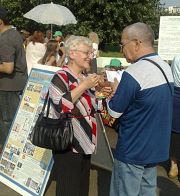 人们驻足与法轮功学员交谈,了解真相