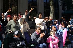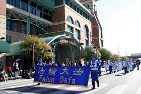 身着亮丽汉服天国乐团是首次在马丁路德金大游行亮相,他们神采奕奕,演奏独特,格外醒目;随后是精美的花车,身着黄色炼功服的法轮功学员在上面演示法轮功功法,舒缓的音乐与炼功动作,吸引了观众的目光,并赢得观众喝彩:“棒极了(Wonderful), 太美了(Beautiful)。”一路上观众中不断传出叫好声,并有观众模仿炼功动作,还有的拿着录影机和照像机抢拍这美好的镜头。