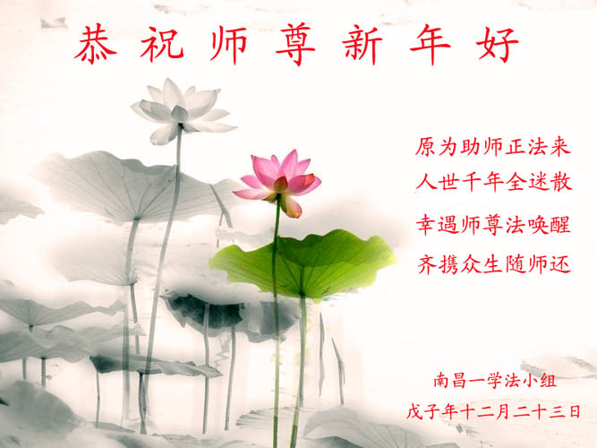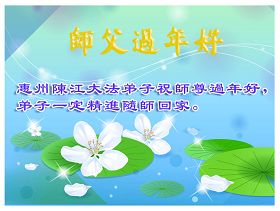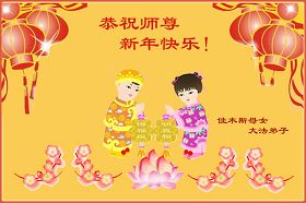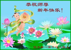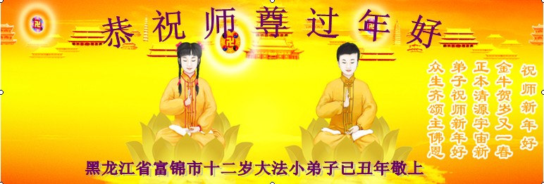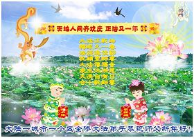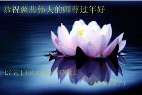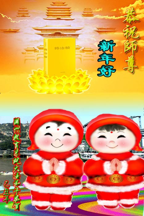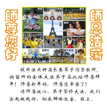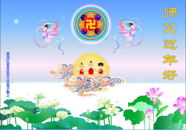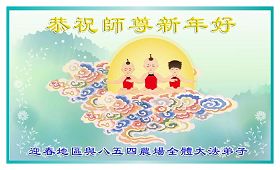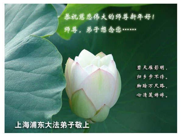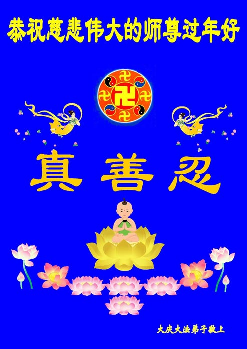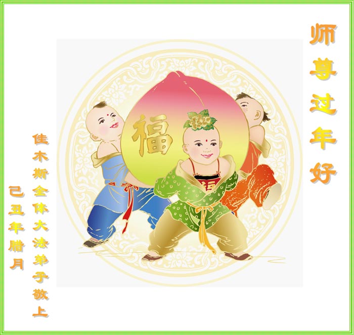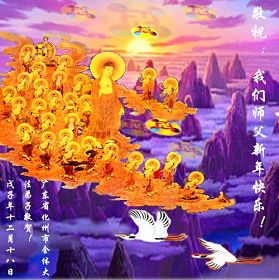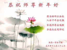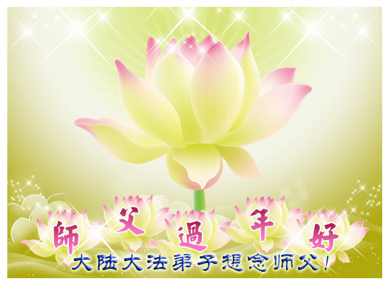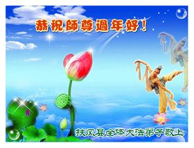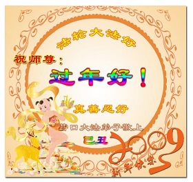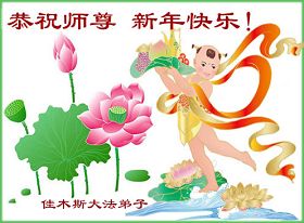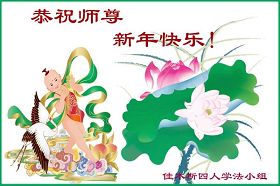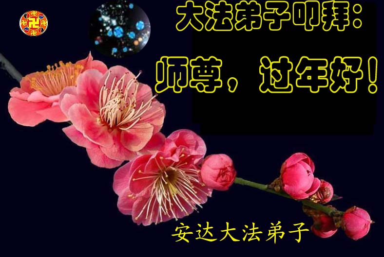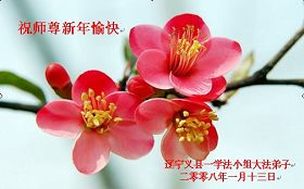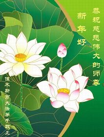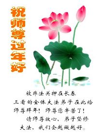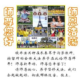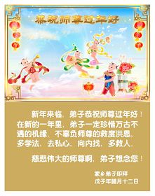 在中国新年到来之时,我们怀着无比崇敬至尊至高的心情衷心祝福师父中国新年快乐!弟子们想念师父,多想与师父同在,返本归真,回到我们真正的家园。为此只有加倍努力做好三件事,无条件的向内找,修去为私为我的旧宇宙观念,去掉最后根本的执着。讲清真相、救度众生,正念正行,完成正法时期大法弟子的伟大使命!