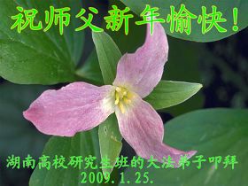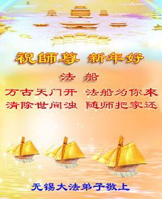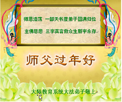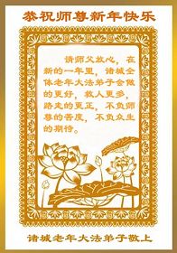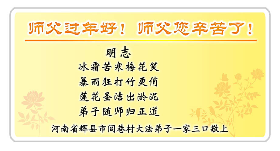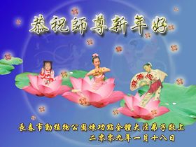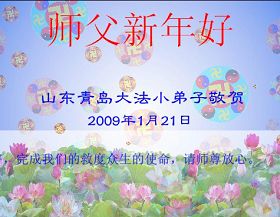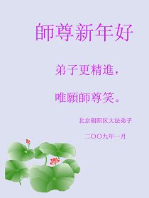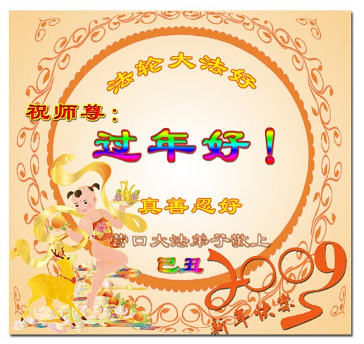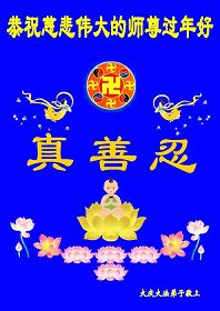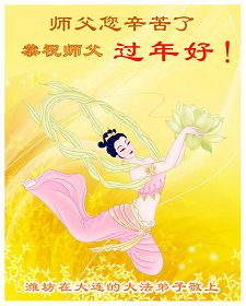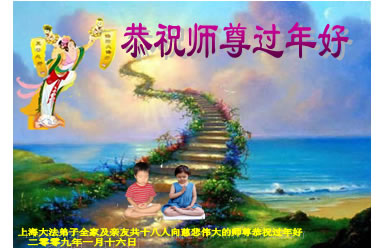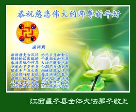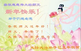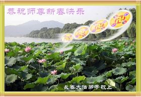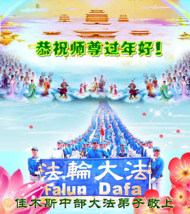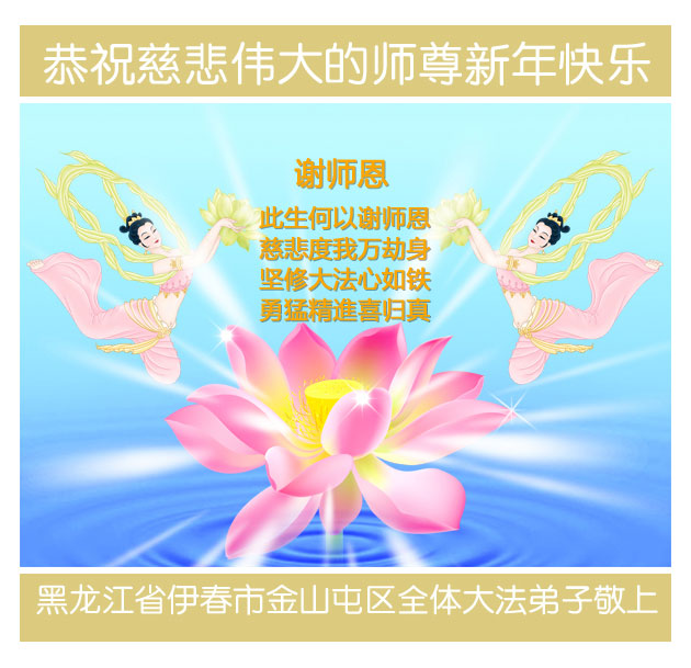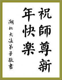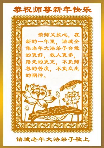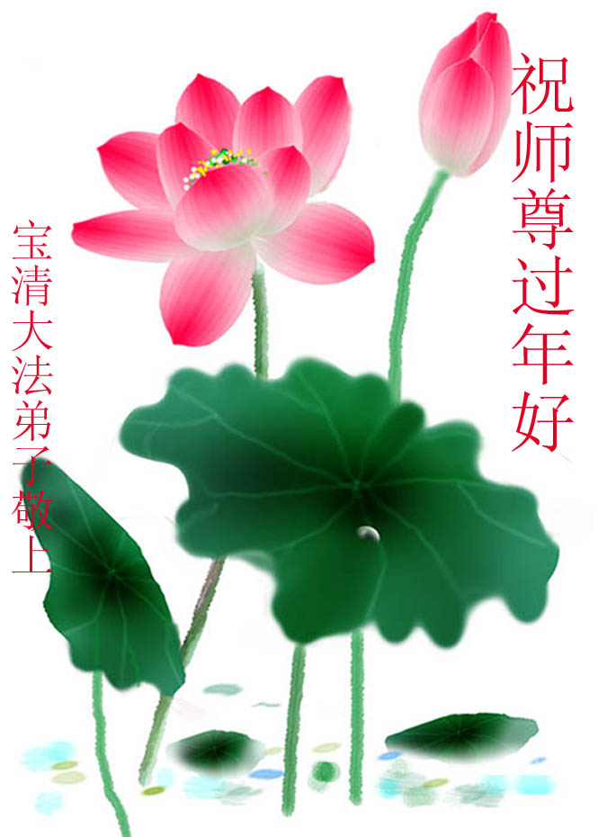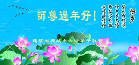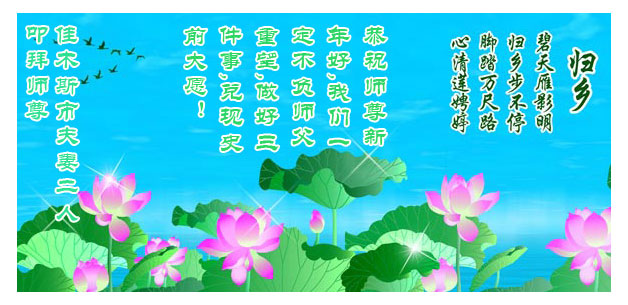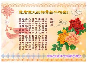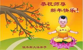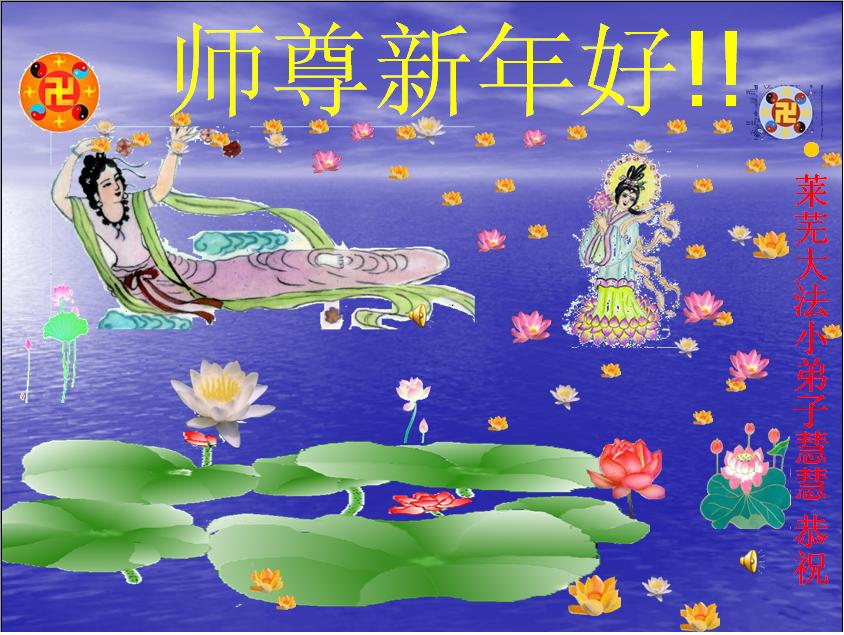 在中国新年到来之时,我们怀着无比崇敬至尊至高的心情衷心祝福师父中国新年快乐!弟子们想念师父,多想与师父同在,返本归真,回到我们真正的家园。为此只有加倍努力做好三件事,无条件的向内找,修去为私为我的旧宇宙观念,去掉最后根本的执着。讲清真相、救度众生,正念正行,完成正法时期大法弟子的伟大使命!