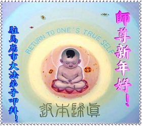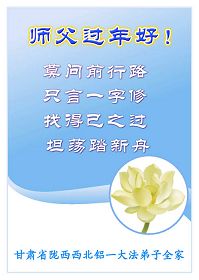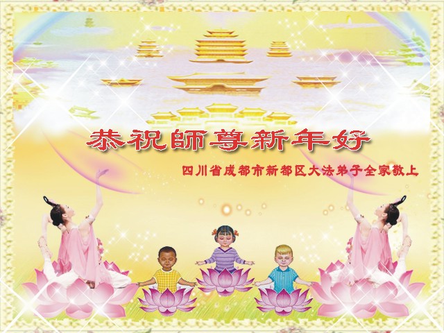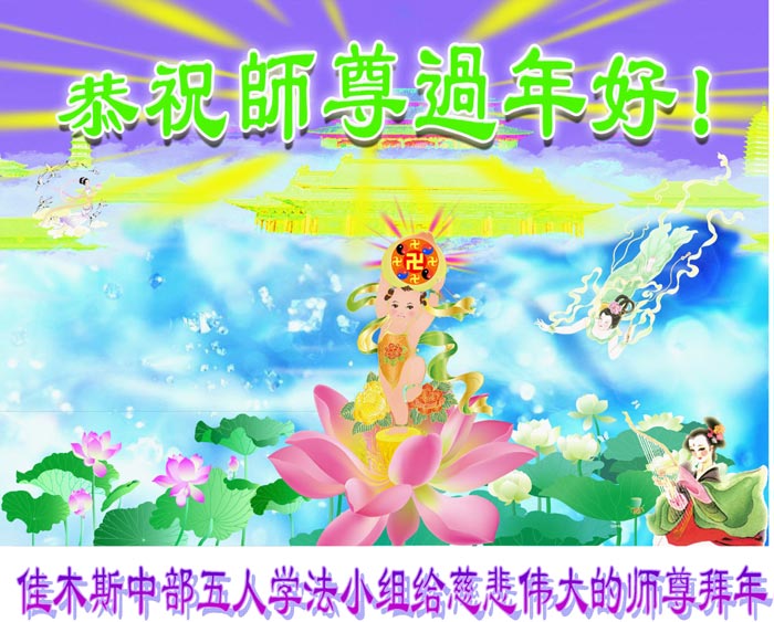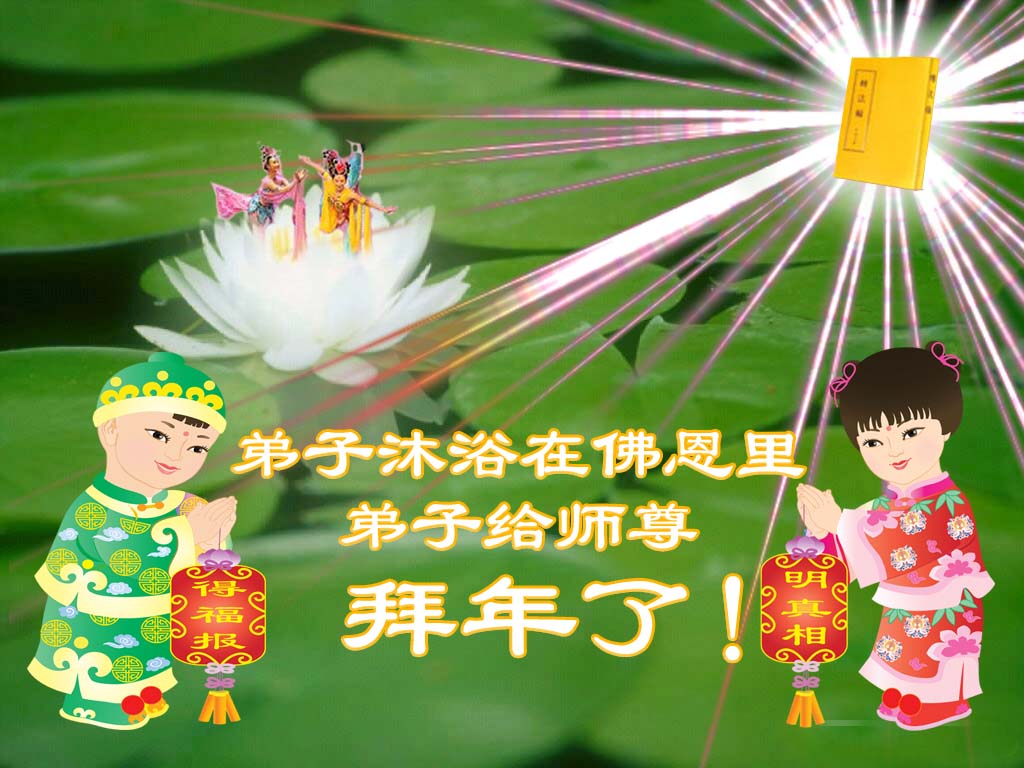 伟大的师尊新年好。我们在这里代表全家给师尊拜年,师尊新年好!弟子们一定更加精進的做好三件事,谢谢伟大的师尊!
