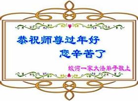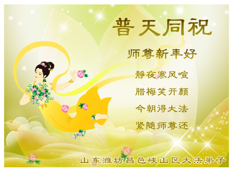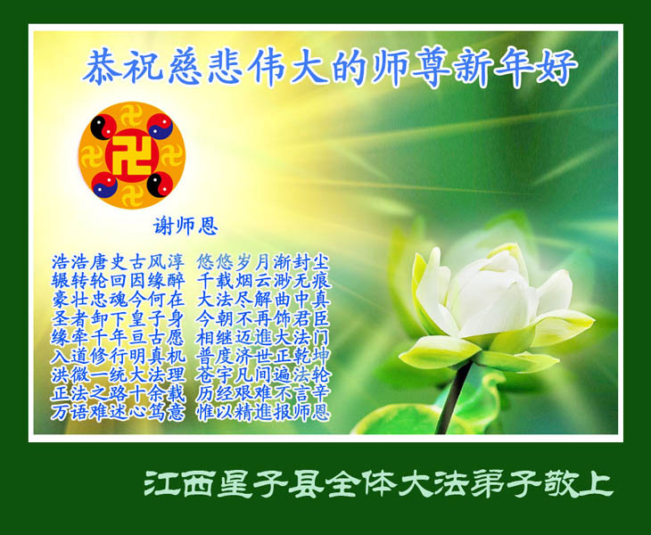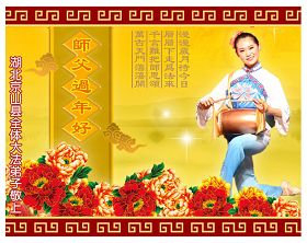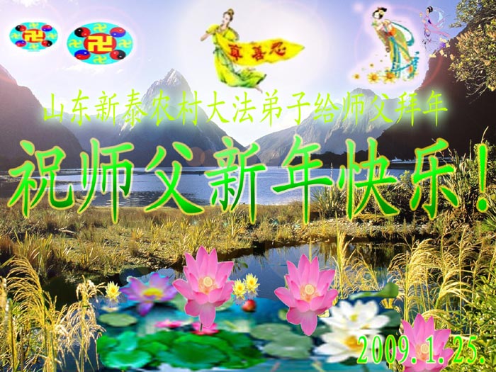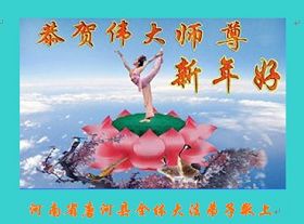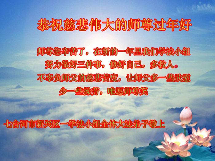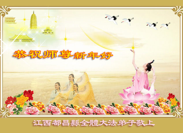 随着岁月的流失,又一个新年即将到来。在这辞旧迎新的日子里,我们全乡镇的大法弟子向伟大的恩师拜年!祝师尊新年快乐!弟子们思念我们伟大的师尊。在这瞬间即逝的宝贵时间里,我们要紧跟师父的正法進程,去掉各种执著,精進实修,学好法,做好三件事,比学比修,整体升华,整体提高。圆容师尊所要的,不辜负恩师的期盼。完成我们肩负的重任——救度众生,圆满随师把家还。谢谢恩师。