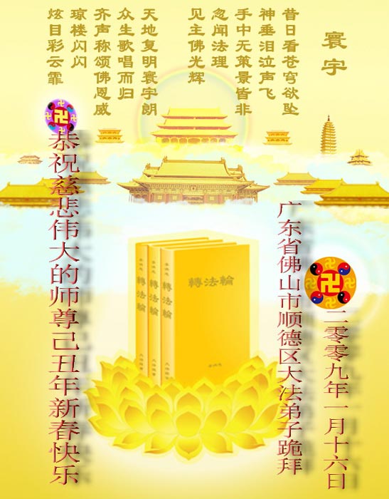 在己丑年新年来临之际,我们一家九位大法弟子怀着崇敬的心情向慈悲伟大的师尊拜年!祝师尊新年快乐!感谢师尊的慈悲救度!