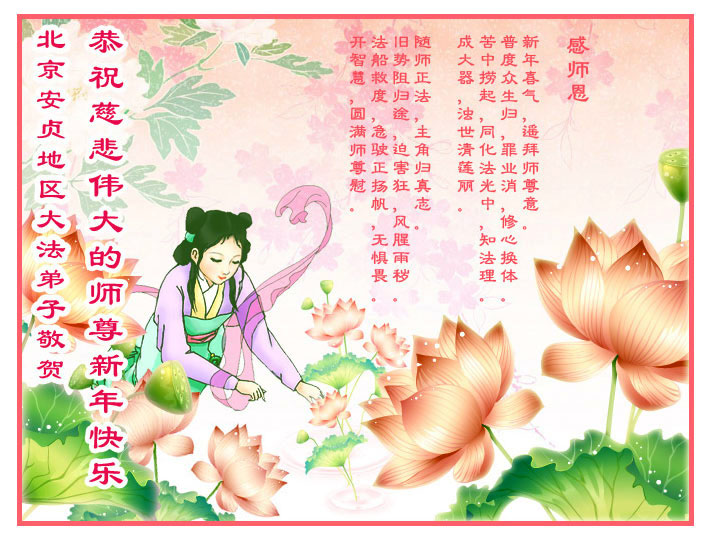 在中国的传统佳节新年到来之际,北京市大法弟子恭贺慈悲伟大的师父新年好!新年快乐!师父辛苦了!