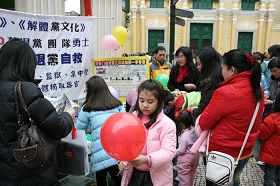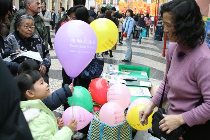 法轮功的真相资料。为向澳门市民及中外游客恭贺中国新年,学员们特地派发写有“法轮大法好”字样的气球送给过往的小朋友们。在佳节来临之际,法轮功学员们把真相和法轮大法的美好带给人们,也给人们新的一年送上最真挚的祝福。