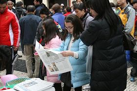【明慧网二零零九年一月二十六日】二零零九年一月二十五日,星期日,正好是过中国新年的年三十,澳门最热闹的地方议事亭前地,办年货的人群川流不息。下午二点半,澳门法轮功学员如常来到这里,向过往市民及游客派发大纪元系列社评《九评共产党》和揭露中共在中国大陆