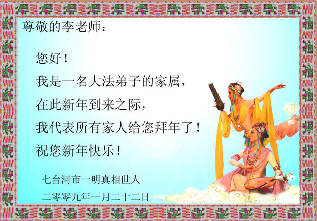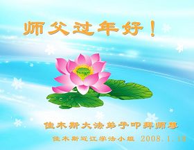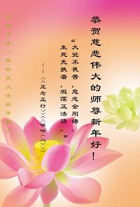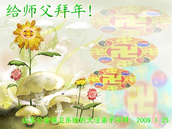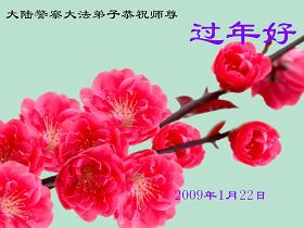 我是一名在中国大陆公安工作的大法弟子。在一年一度的中国传统节日“过年”到来之际,恭祝师尊及家人新年好!您的弟子决心在新的一年,在特殊的工作环境修好自己,同时理智智慧地讲真相劝三退,不辜负师尊的殷切期望,完成好自己的史前大愿。2009-1-23