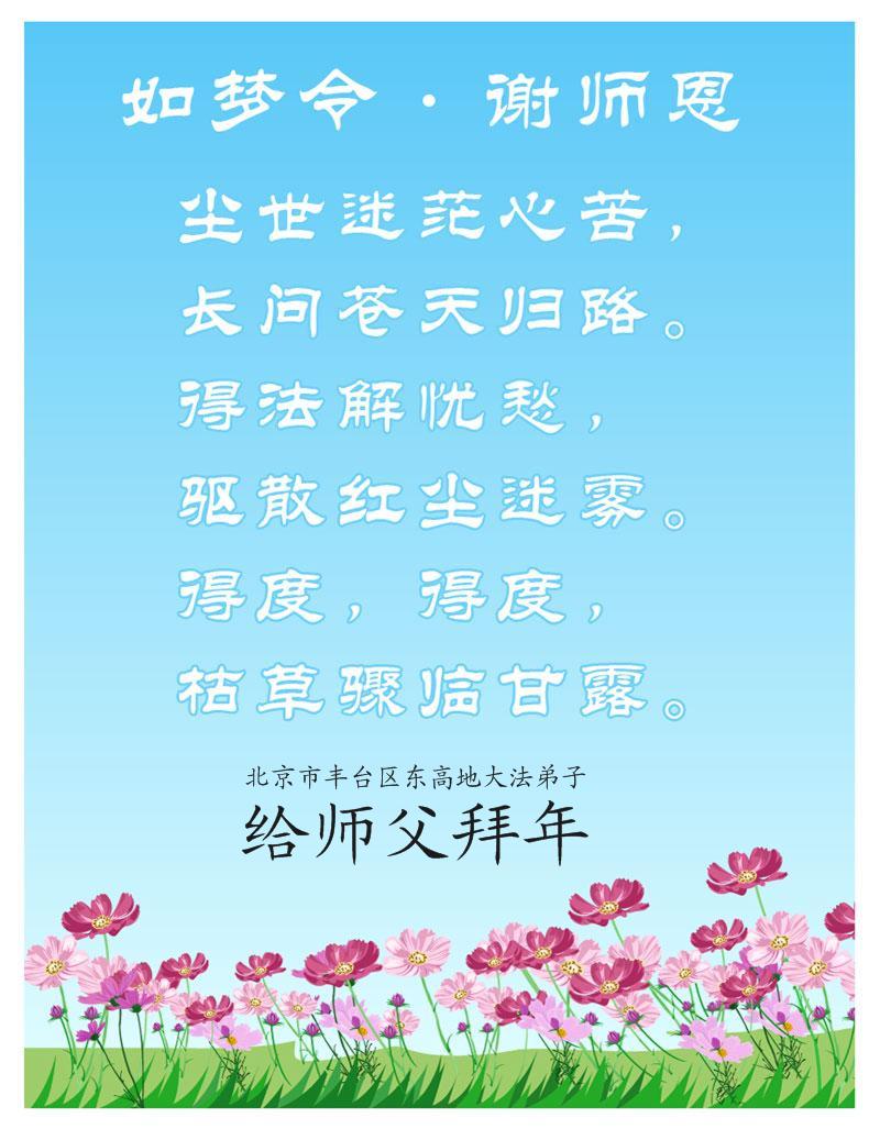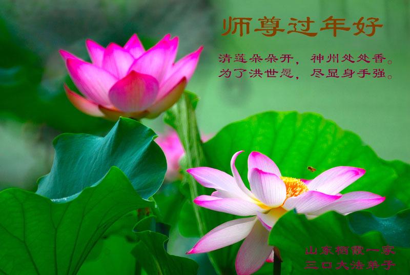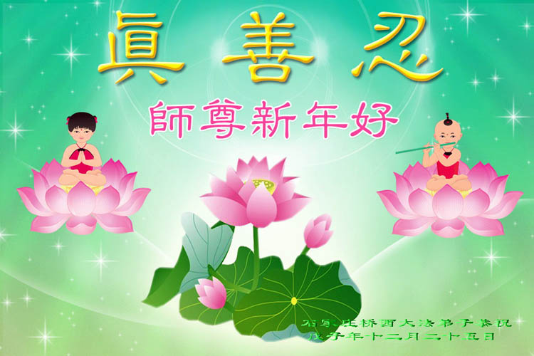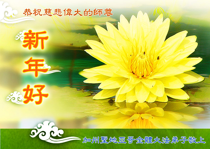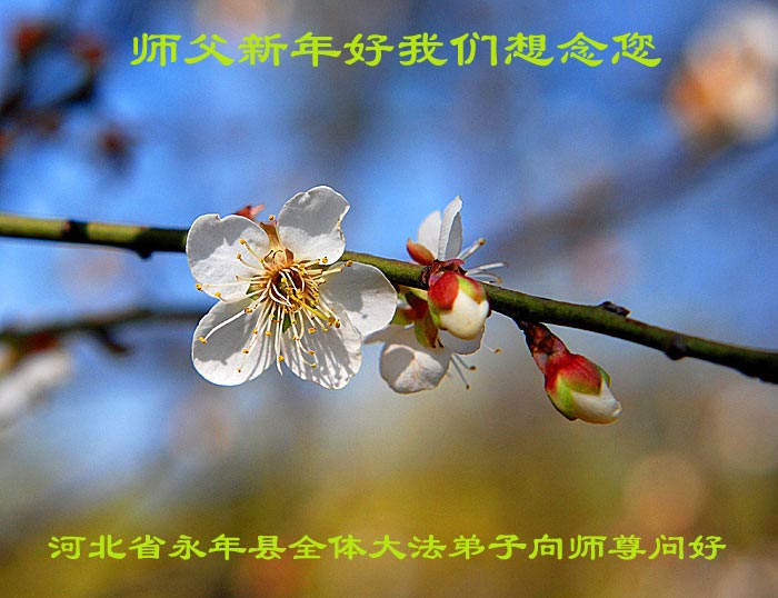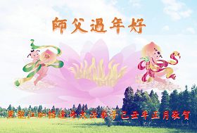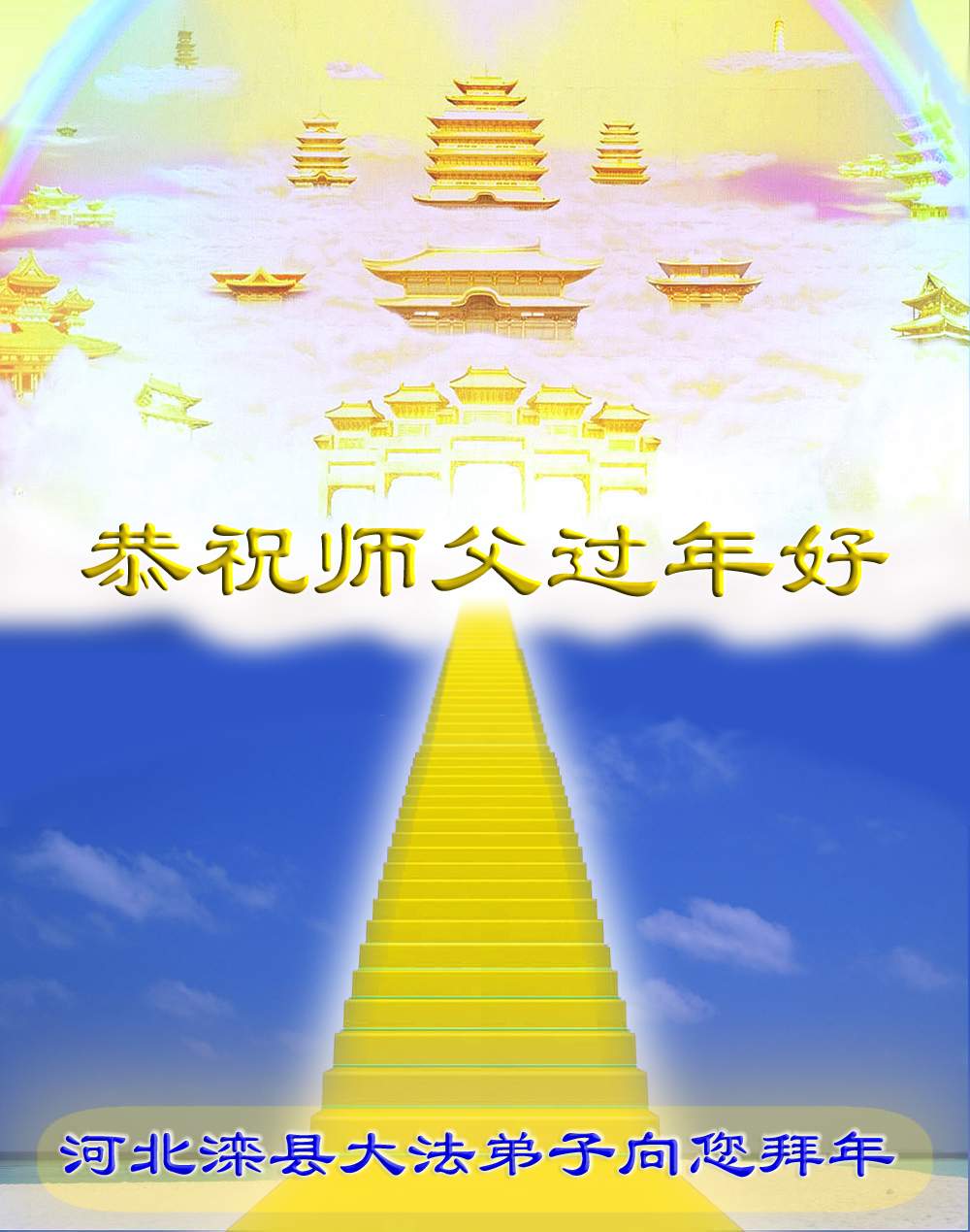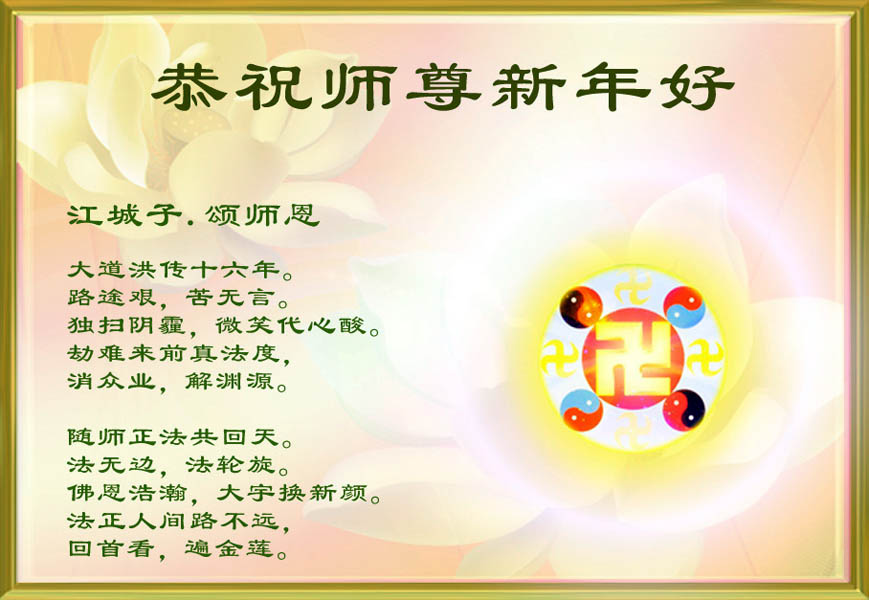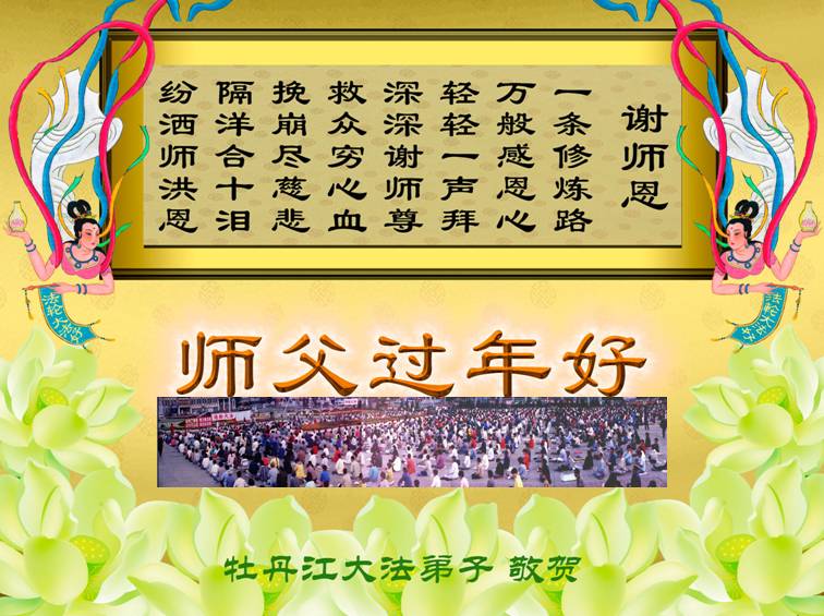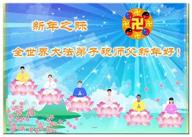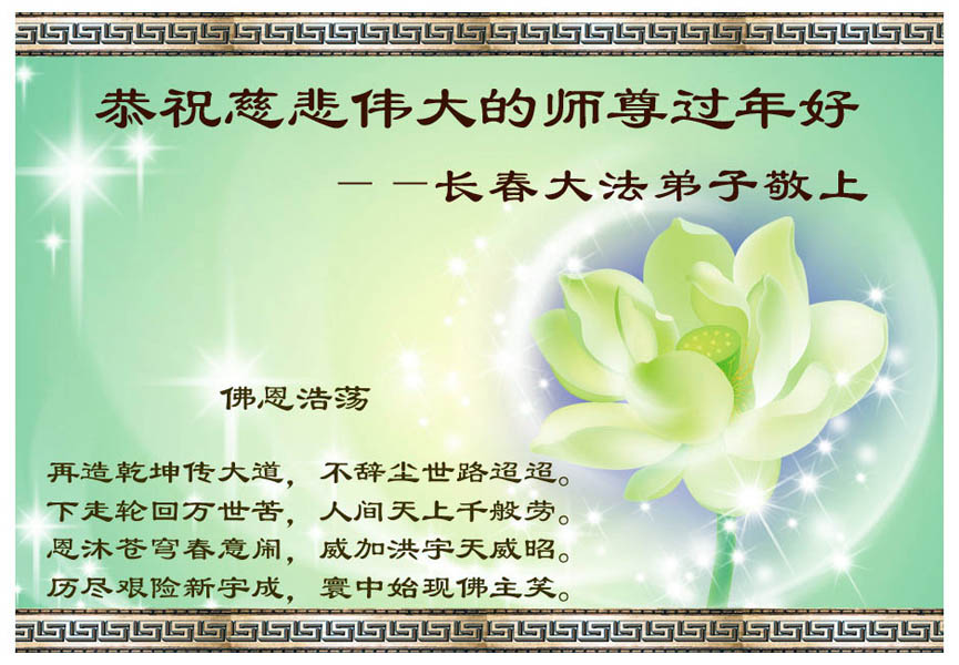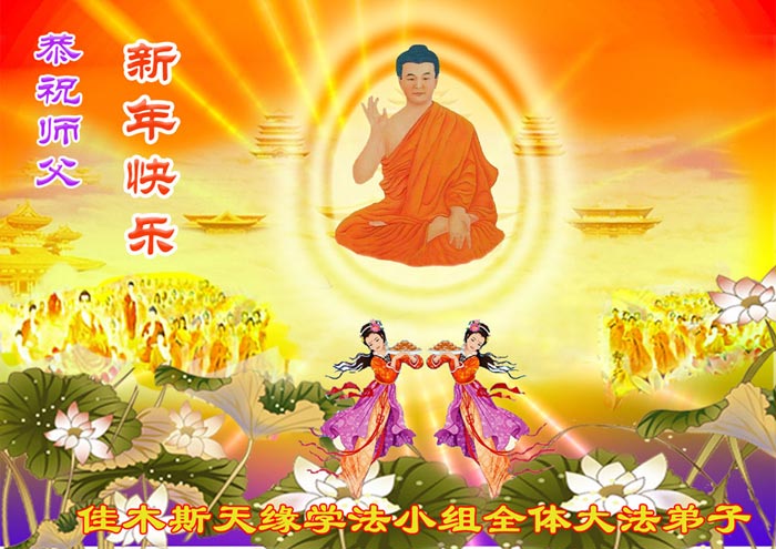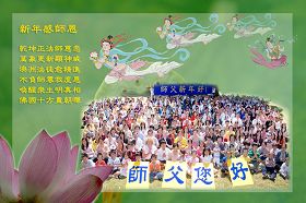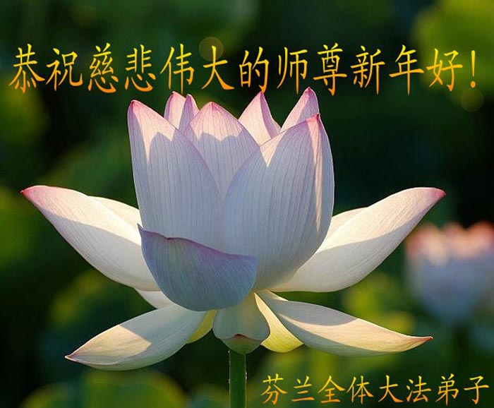 新年到了,我们给您拜年!恭祝师尊新年快乐!我们深深感恩师尊的慈悲苦度和佛恩浩荡!在风风雨雨中,在魔难中我们走到了今天,每一步都离不开师尊的慈悲呵护。我们会珍惜所走过的路,更加努力走好最后的路。作为“正法时期的大法弟子”,我们还远未真正达到标准和要求,与精進的同修比,差距很大。在新的一年里,我们要在做好“三件事”中,修好自己,多救度一些众生和世人,不负使命、不负师尊的慈悲苦度。
