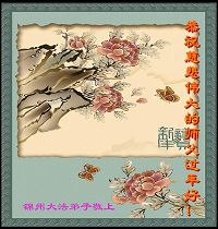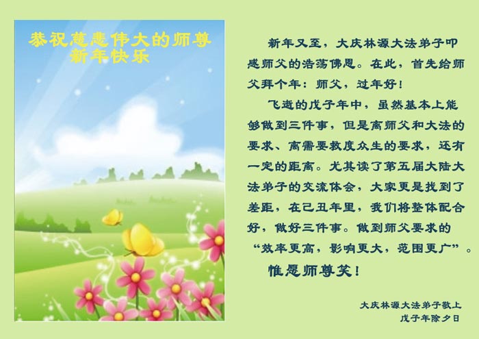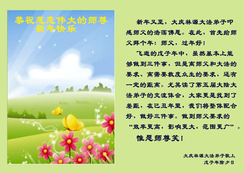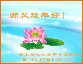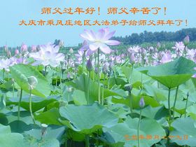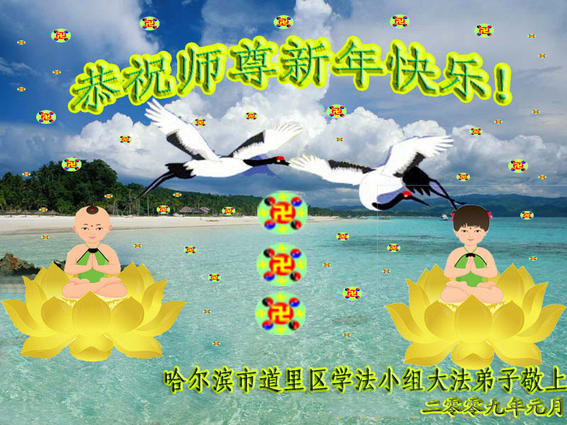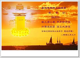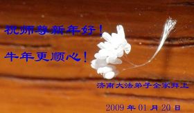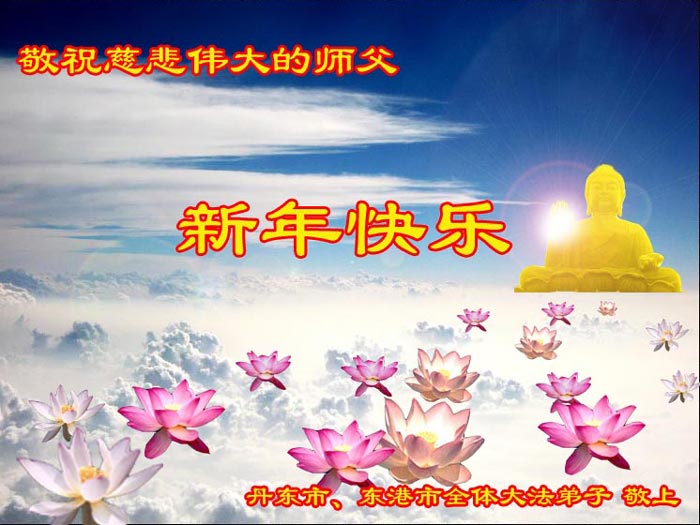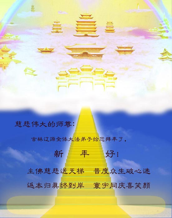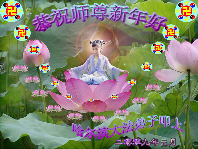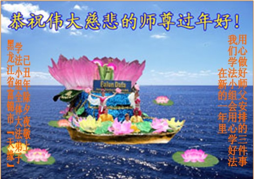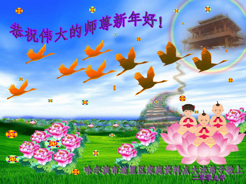 在此仅仅代表我与我的家人同修,以及我们的小组同修,向伟大的师尊问候:新年好!怀念师尊在锦州传法的时刻,师尊辛苦了。