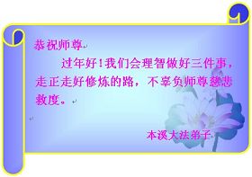 弟子一定不辜负您的期望,不辱史前大愿,精進不止,认真做好“三件事”,最大限度救度众生!请师父放心!新年之际,弟子给师父拜年:祝师父过年好!师父辛苦了!
