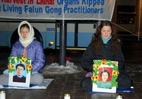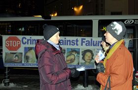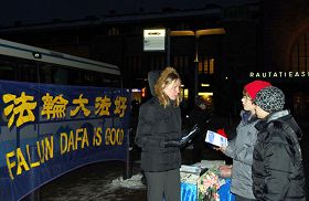 寒冷的冬日,积雪成堆,法轮功学员们静静的手捧死难同修的遗像一排坐开。这肃穆的场景,向民众诉说着自九九年中共开始打压法轮功至今,在明慧网上公布的被迫害致死的法轮功学员就达三千二百三十六人,那些不知姓名的、惨遭活摘器官后焚尸灭迹的、被逼流离失所葬身异乡的、被迫害致死又无从查询的……又有多少?这肃穆的场景,也引来了善良的芬兰民众的关注,不时的看到有年轻人在排队等待签名声援法轮功。